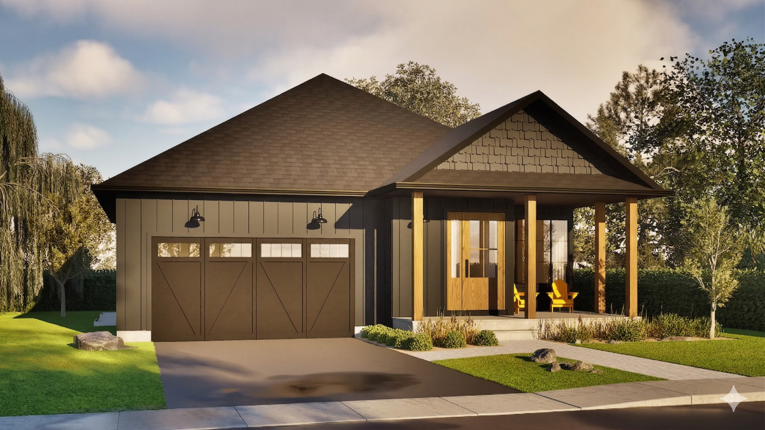 The striking exterior features engineered-wood siding on all sides, bold black windows and trim, and a welcoming full-width front porch, anchored by an impressive 8-foot glazed entryway with warm wood accents—creating a sophisticated yet inviting presence on the street.